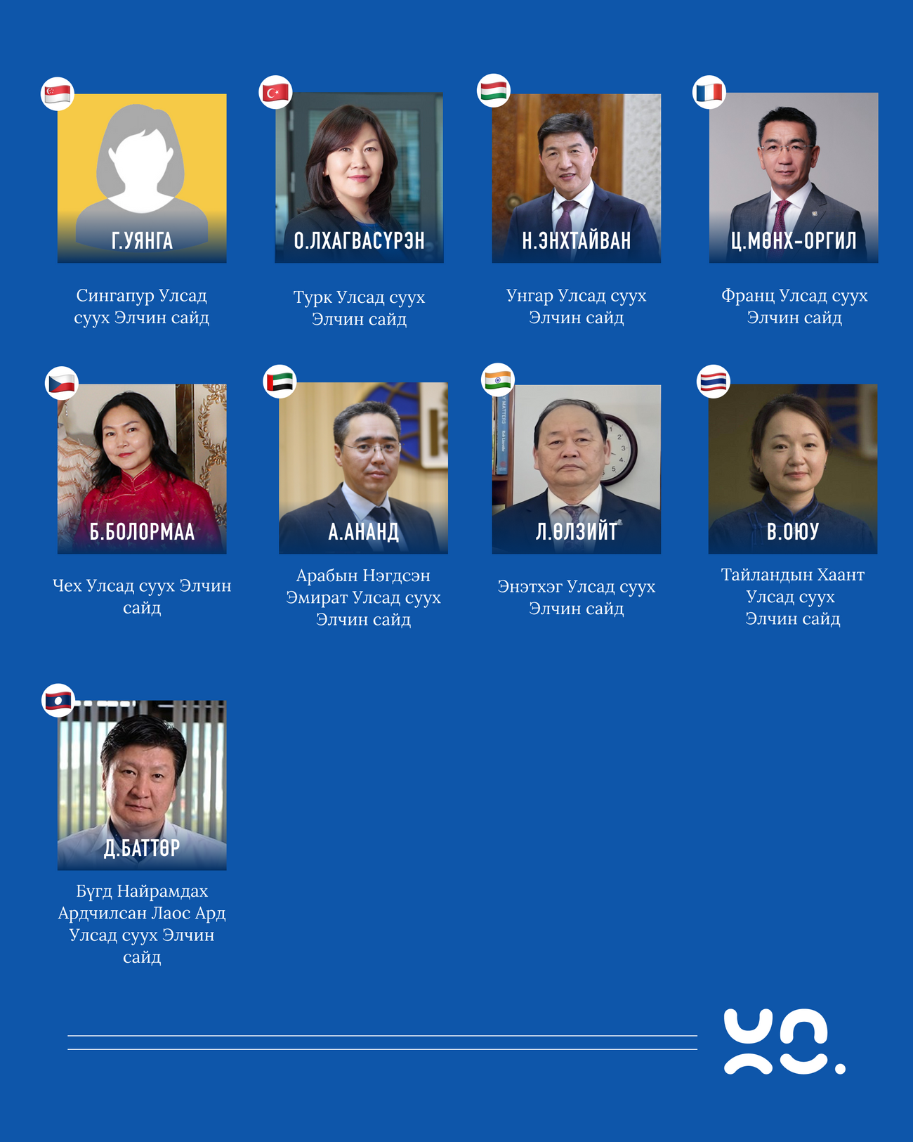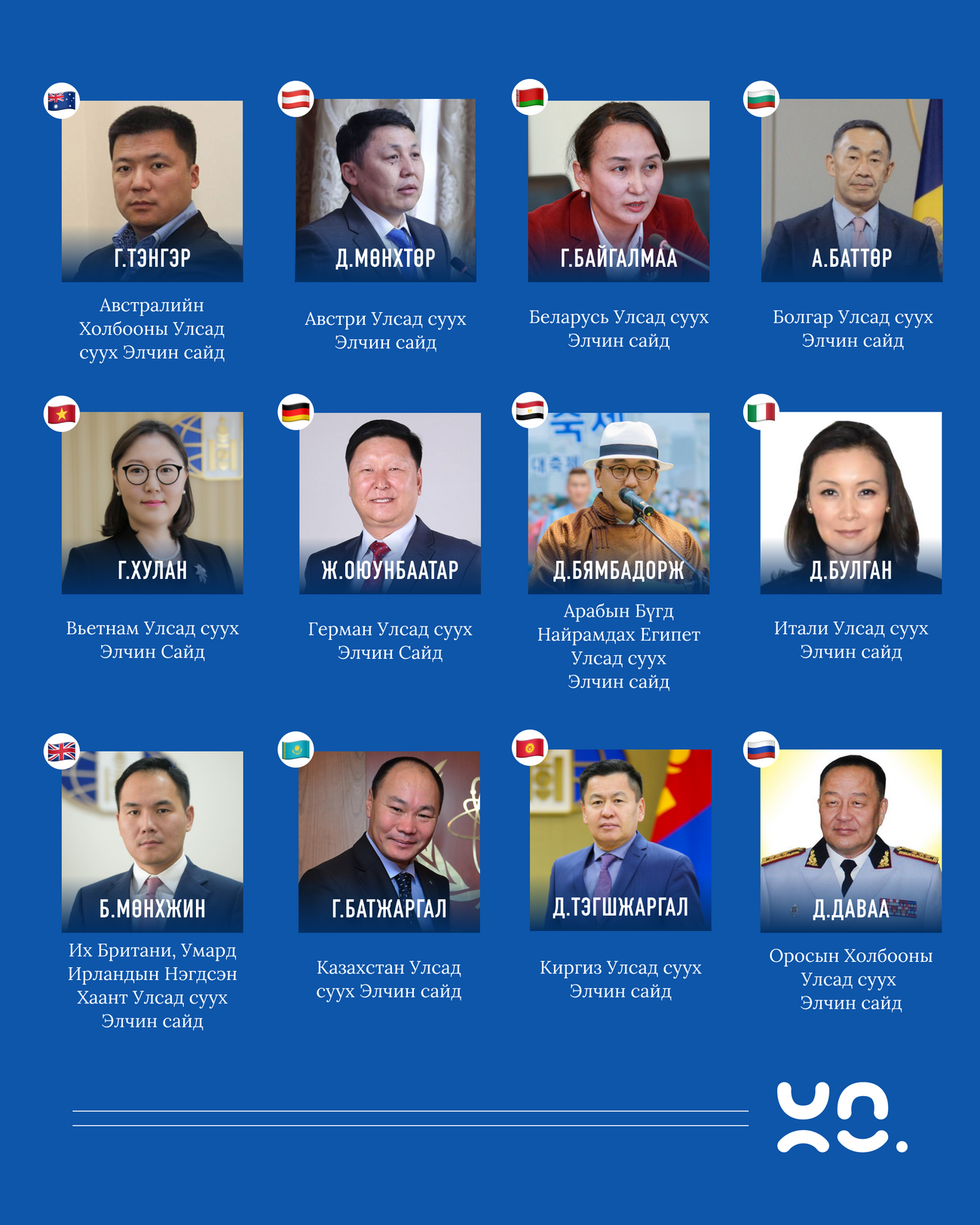 Үүний дотор Гадаад хэргийн сайд асан Ц.Мөнх-Оргил Бүгд Найрамдах Франц Улсад суух, Гадаад харилцааны сайд асан Н.Энхтайван Бүгд Найрамдах Унгар Улсад суух, Гадаад харилцааны дэд сайд асан Н.Энхтайван Их Британи, Умард Ирландын Нэгдсэн Хаант Улсад суух Элчин сайдаар танилцуулжээ.