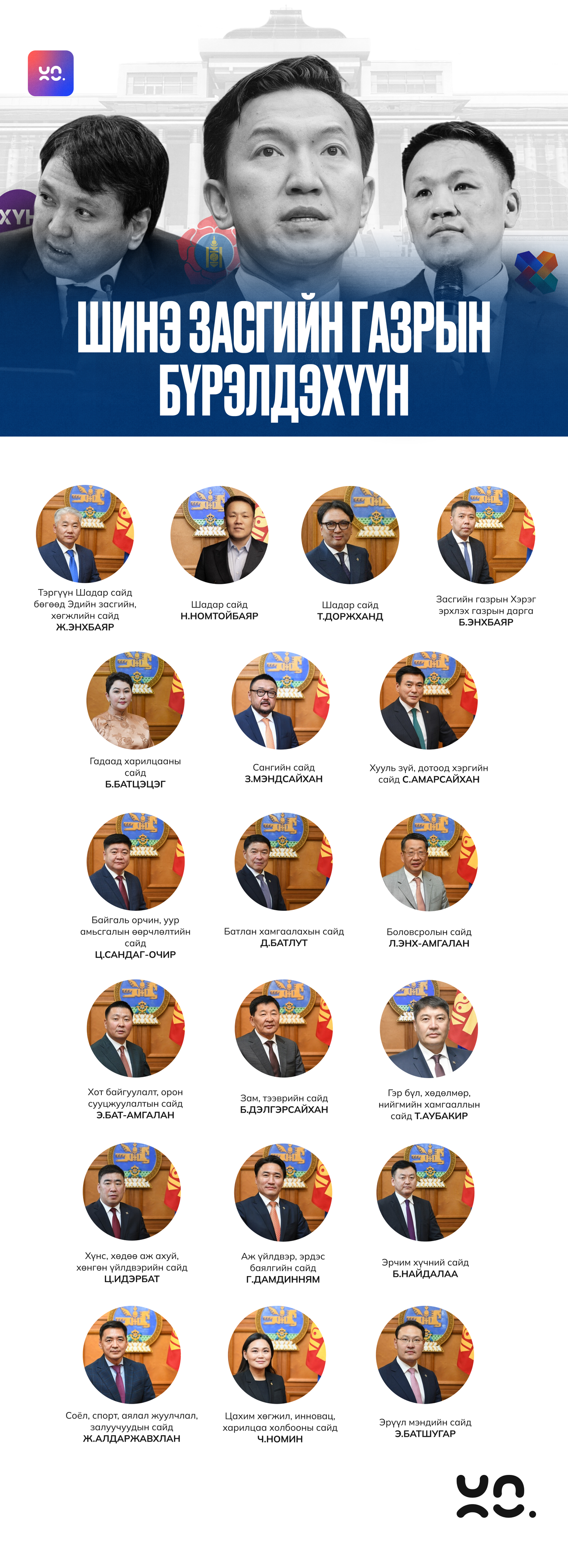 Шинэ кабинетын бүрэлдэхүүнд өмнөх Засгийн газрын долоон сайд суудалдаа үлдсэн бол 12 сайдыг шинээр томилж байна. Н.Учралын Засгийн газарт ХҮН намаас хоёр, Үндэсний эвслээс нэг төлөөлөл багтжээ.