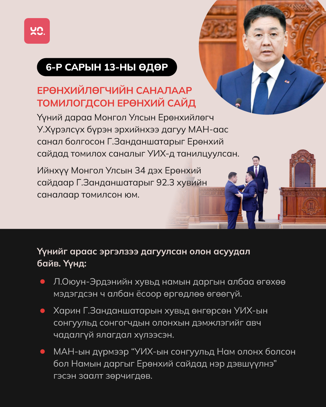 Улсын Их Хурлын гишүүн П.Сайнзориг нарын 50 гаруй гишүүн Ерөнхий сайд Г.Занданшатарыг огцруулах саналыг энэ сарын 10-ны өдөр УИХ-д албан ёсоор тавьсан.